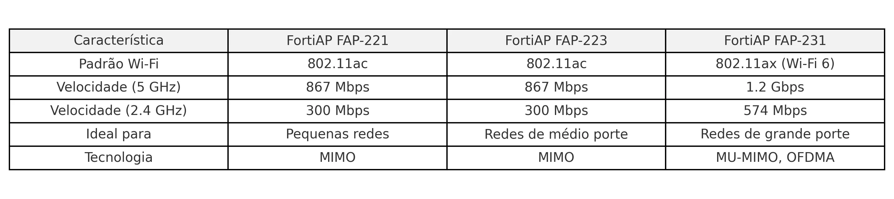 Para empresas que demandam alto desempenho em ambientes com grande quantidade de dispositivos conectados, o FortiAP FAP-231G é a melhor escolha. Com tecnologia mais avançada e suporte ao padrão 802.11ax (Wi-Fi 6), ele garante velocidades superiores e maior eficiência em redes congestionadas.