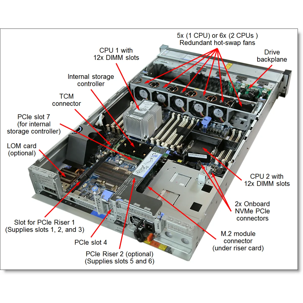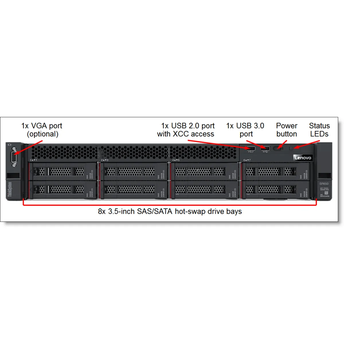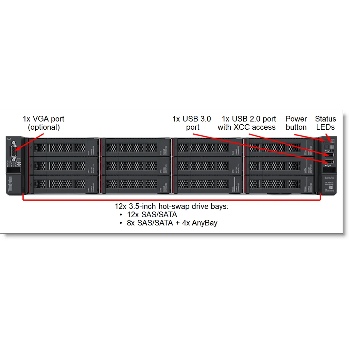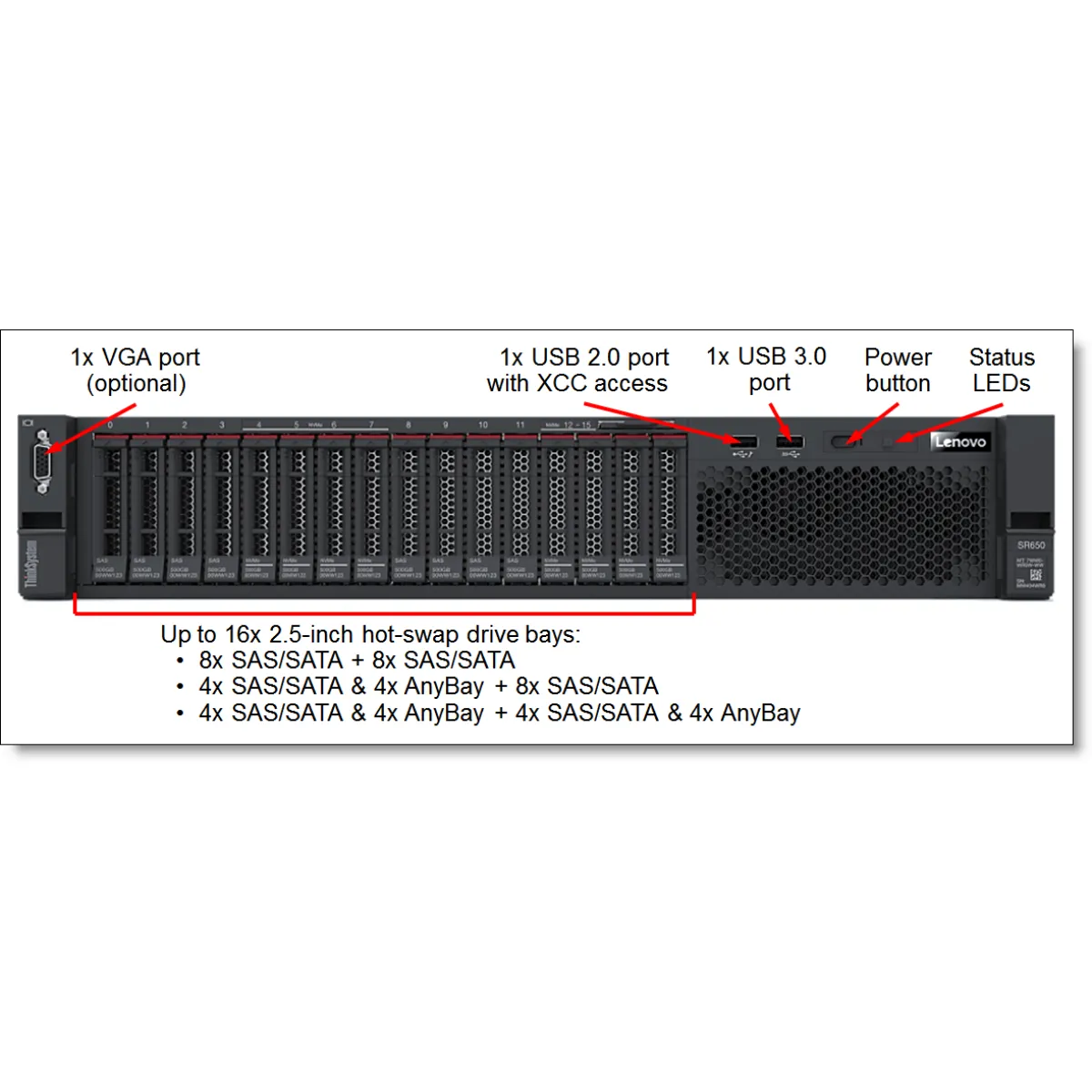 O Lenovo ThinkSystem SR650 é um servidor em rack de dois soquetes desenvolvido para oferecer velocidade e expansão, com armazenamento e E/S flexíveis e a maior confiabilidade do mercado para cargas de trabalho críticas para o negócio. O ThinkSystem SR650 oferece suporte a análise de dados, nuvem híbrida, infraestrutura hiperconvergente, vigilância por vídeo, computação de alto desempenho e muito mais. O design do Lenovo AnyBay apresenta opções de tipo de interface de unidade no mesmo compartimento: unidades SAS, unidades SATA ou unidades U.2 NVMe PCIe. Com a liberdade de configurar alguns dos compartimentos com SSDs PCIe e ainda usar os restantes para unidades SAS de capacidade, você pode fazer um upgrade para mais SSDs PCIe no futuro, conforme necessário. O Lenovo XClarity Controller é o mecanismo de gerenciamento integrado em todos os servidores ThinkSystem desenvolvido para padronizar, simplificar e automatizar as tarefas de gerenciamento do servidor da base. A execução do XClarity Integrator ajuda a simplificar o gerenciamento de TI, agilizar o provisionamento e conter custos integrando perfeitamente o XClarity em um ambiente de TI existente.