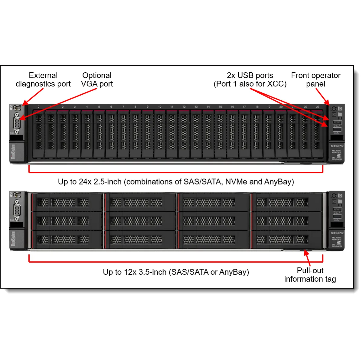 O Lenovo ThinkSystem SR650 V2 é um servidor de rack de 2 soquetes desenvolvido para oferecer mais velocidade e expansão, com armazenamento flexível, E/S e a maior confiabilidade do setor para cargas de trabalho essenciais aos negócios. A Lenovo oferece soluções de TI projetadas, testadas e certificadas de alto desempenho, escalonáveis e econômicas. Ao combinar a confiabilidade e a tecnologia de servidor x86 líderes da indústria, em parceria para entregar a melhor coinovação da categoria e proporcionar tranquilidade de ponta a ponta com os Lenovo ThinkShield, XClarity e Services, as soluções da Lenovo permitem que os clientes usem dados em tempo real para gerar insights acionáveis. Como a computação para essas soluções, o ThinkSystem SR650 V2 torna os negócios mais inteligentes, fornecendo suporte para análise de dados, nuvem híbrida, infraestrutura hiperconvergente, vigilância por vídeo, computação de alto desempenho e muito mais. O design de backplane líder do setor do Lenovo AnyBay™ apresenta uma escolha de tipo de interface de unidade no mesmo compartimento de unidade: Unidades SAS, SATA ou U.2 e U.3 NVMe PCIe. Com a liberdade de configurar alguns dos compartimentos com SSDs PCIe e ainda usar os restantes para unidades SAS de capacidade, você pode fazer um upgrade para mais SSDs PCIe no futuro, conforme necessário.